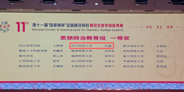 2025年11月28日至11月30日,第十一届“田家炳杯”全国师范院校师范生教学技能竞赛决赛在浙江师范大学举行。我院思想政治教育专业2022级本科生余涵同学在罗凌云老师、潘小军老师的悉心指导下,凭借扎实的基本功和出色的现场表现,在激烈的竞争中脱颖而出,荣获思想政治教育组一等奖。此次获奖,是我院继2023年在该项赛事中取得突破后,连续第二年获得一等奖,体现了我院师范生培养质量与竞赛水平的稳步提升与可持续发展。