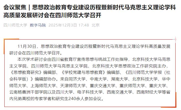 11月30日,思想政治教育专业建设历程暨新时代马克思主义理论学科高质量发展研讨会在四川师范大学召开。